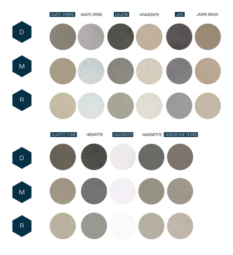 30 coloris au choix, associés à une des qualités intrinsèques d’une pierre naturelle.